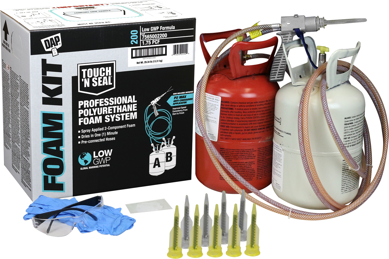 - Kits includes: A & B cylinders, P2 applicator gun with 10 ft hoses, extra spray nozzles, assembly wrench, latex gloves, lubricant and trilingual illustrated instructions (English, Spanish, French)