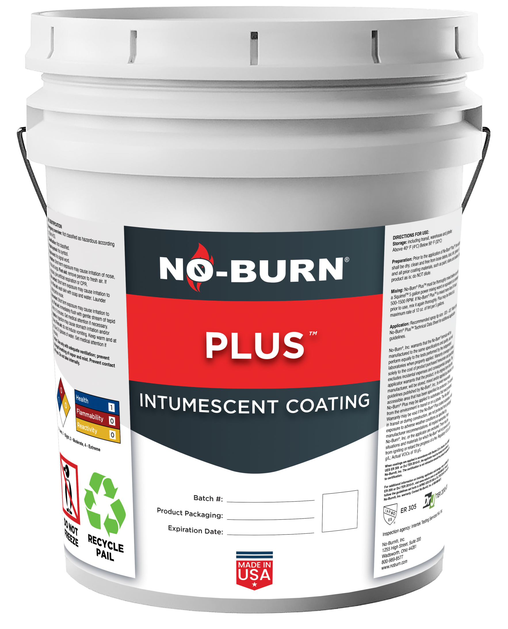No-Burn Plus may be used in any of the Primary Uses expressed and in addition, may have the feasibility to meet other fire performance requirements. As an intumescent non-corrosive product, Plus limits flame spread and smoke developed, providing intumescent protection when applied and where lapped or butted lumber and sheeting edges are joined together. Penetrations or openings for ducts, vents, electrical outlets, lighting, devices, luminaries, wires, speakers, drainage, piping and similar penetrations or openings do not compromise Plus’s performance. Complies with USDA requirements for incidental food contact and ANSI/NSF 51 Food Zone Materials.