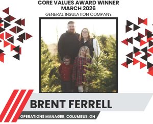 We are excited to announce March’s winner of General Insulation Company’s Core Values Award. Please take a moment to congratulate Brent Ferrell, Operations Manager, Columbus, Ohio, for being March’s Core Values Award Winner! Congratulations, Brent! Your hard work and dedication to General Insulation have been noticed. We are proud of your achievement and we look forward to your continued success. Thank you for demonstrating our Core Values!