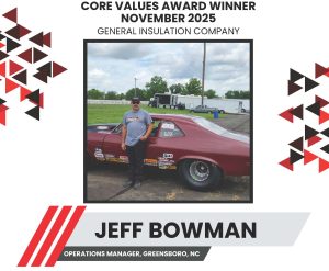 We are excited to announce Novembers’s winner of General Insulation Company’s Core Values Award. Please take a moment to congratulate Jeff Bowman, Operations Manager for the Greensboro, NC, branch, for being November’s Core Values Award Winner! Congratulations, Jeff! Your hard work and dedication to General Insulation have been noticed. We are proud of your achievement and we look forward to your continued success. Thank you for demonstrating our Core Values!
